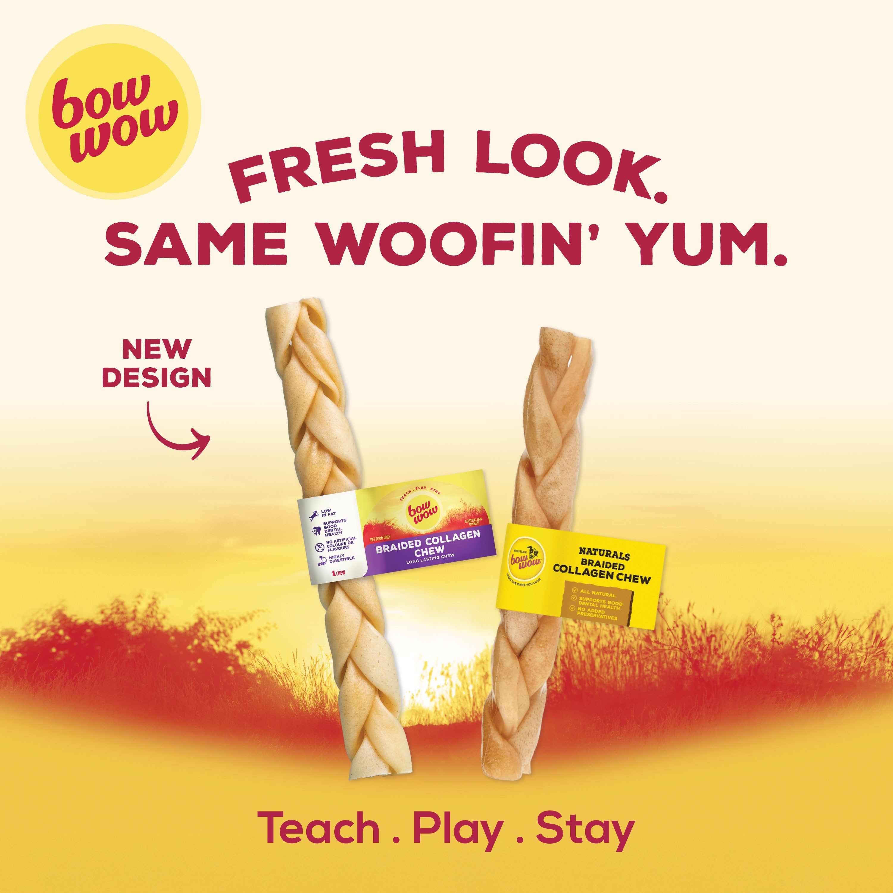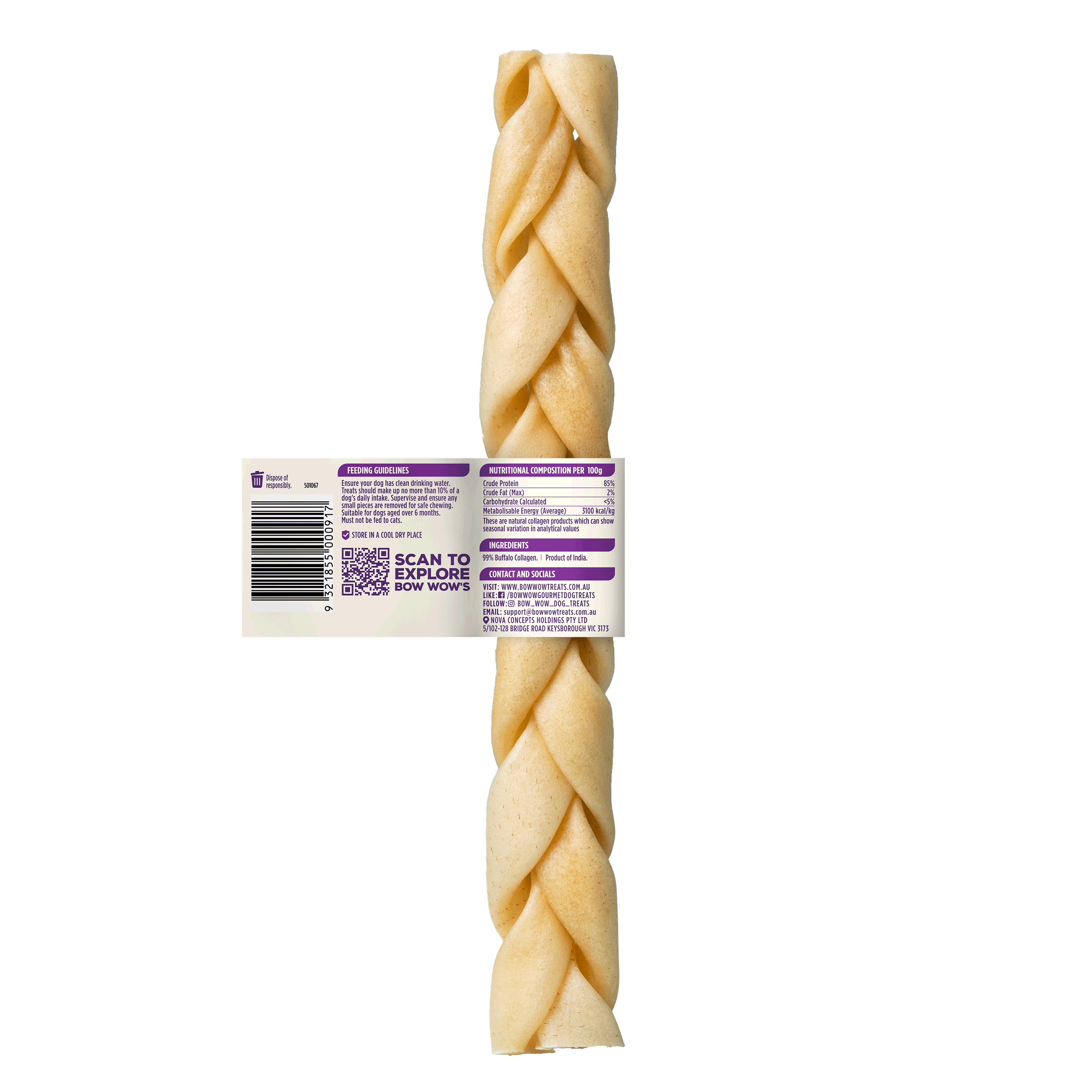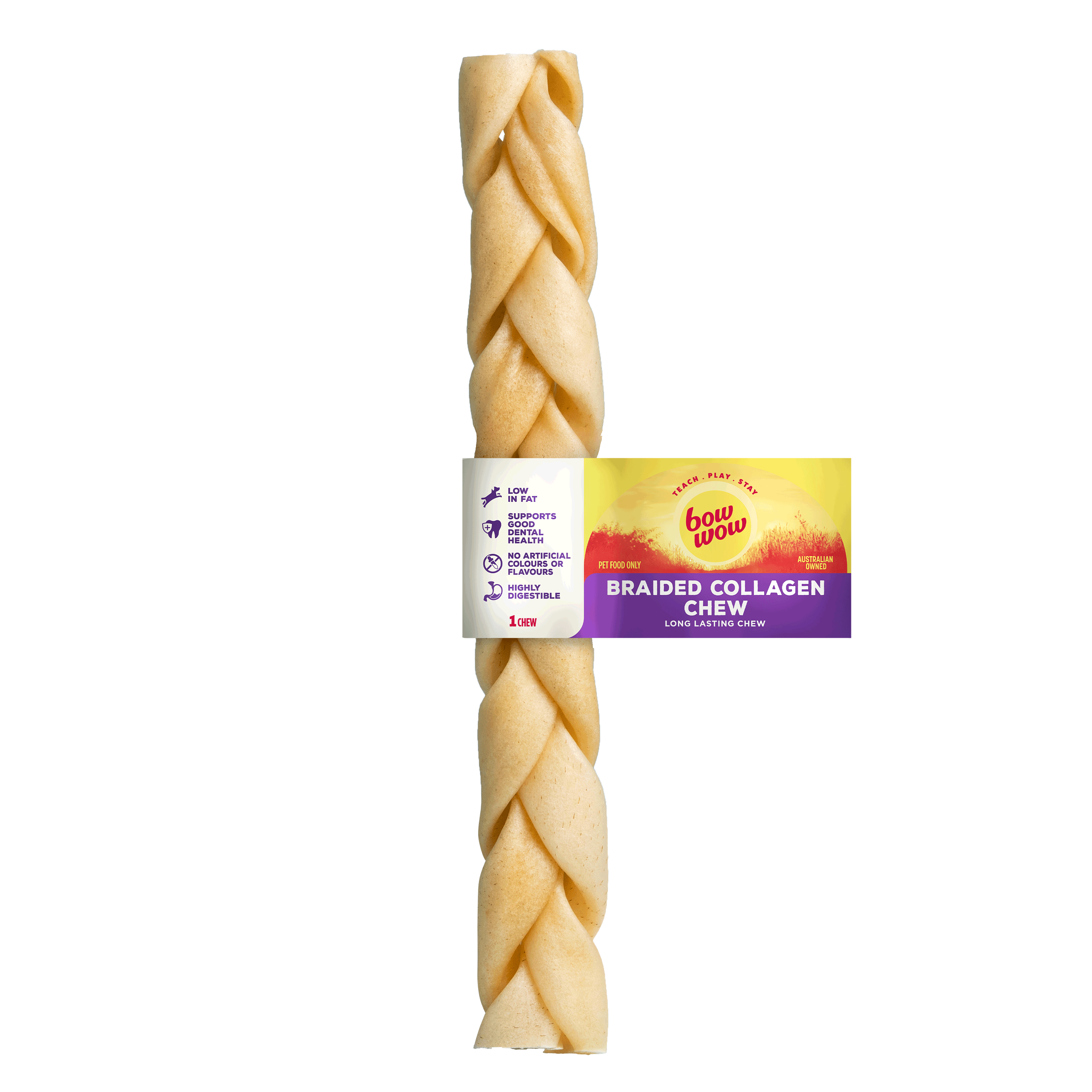 All Natural and long lasting, Bow Wow will keep your dog occupied and satisfied for a long time with our Braided Collagen Chew. Packed with Collagen, protein and with no artificial colours, flavours or preservatives, this tasty treat is sure to please any dog.