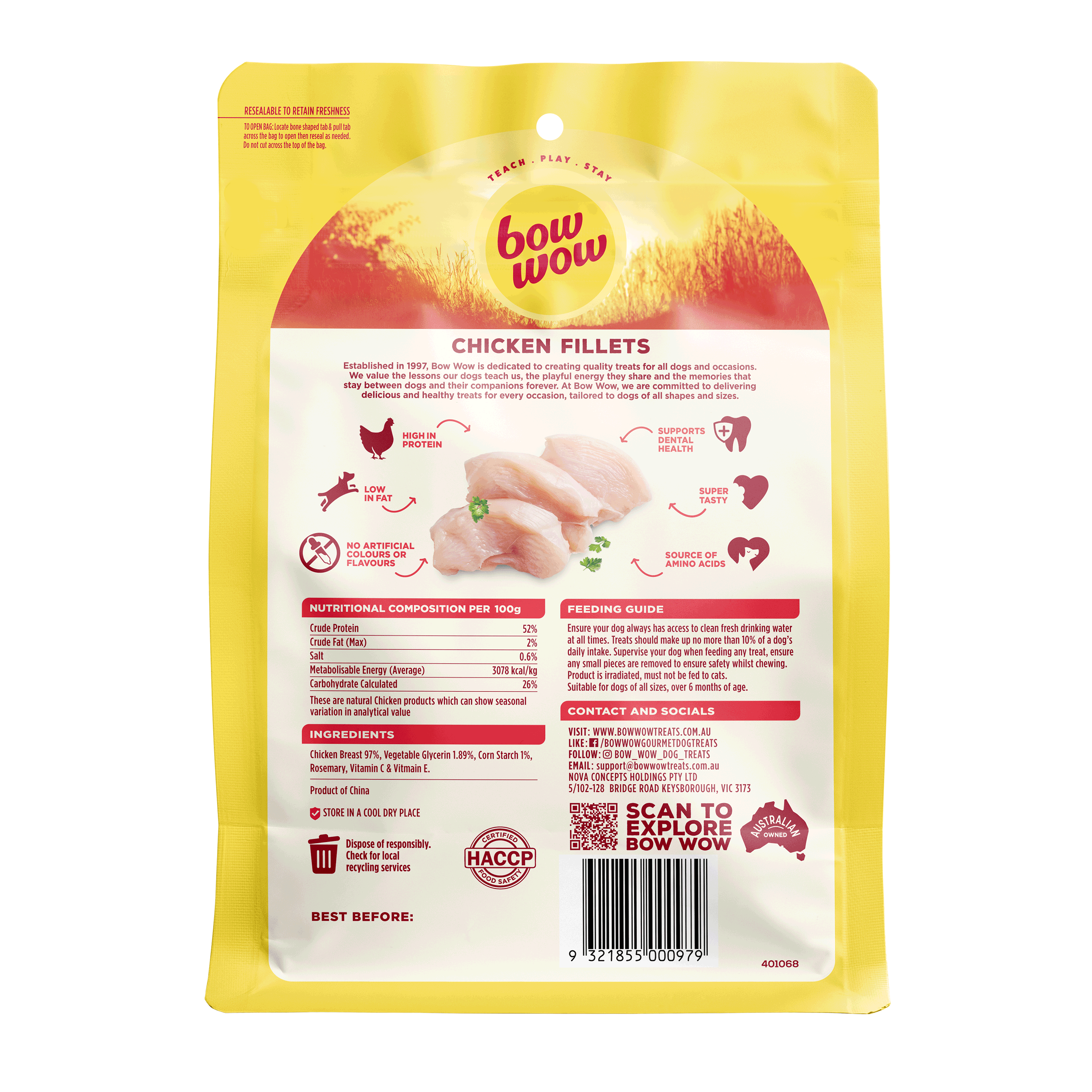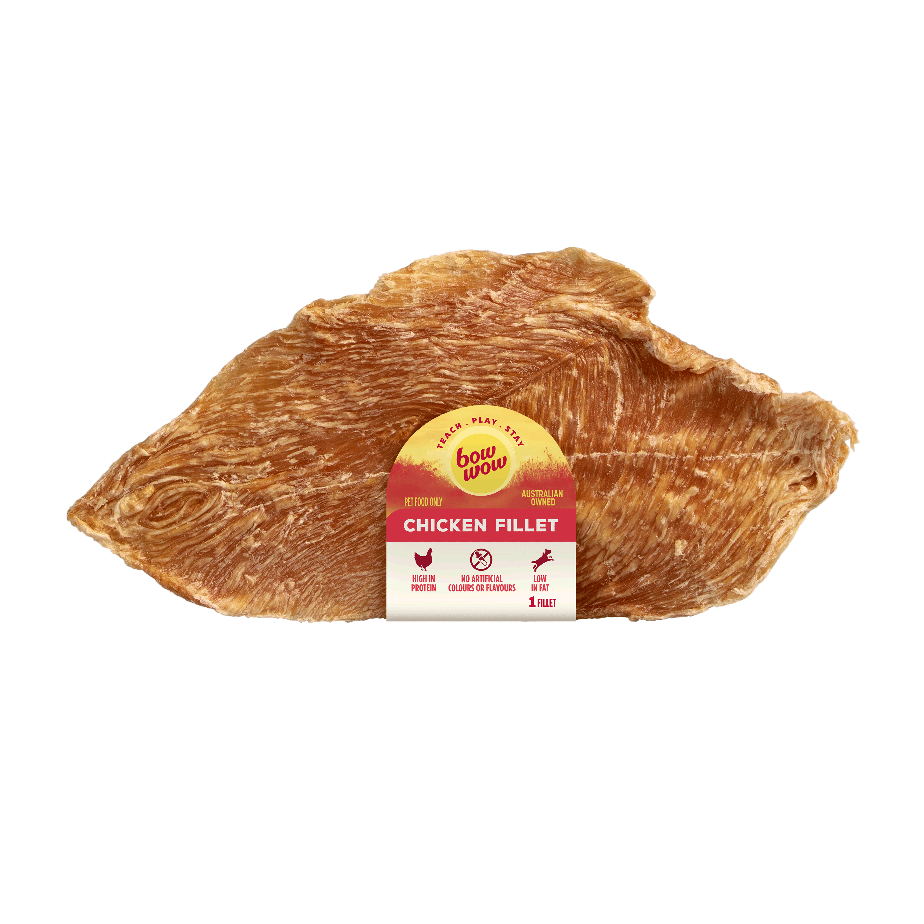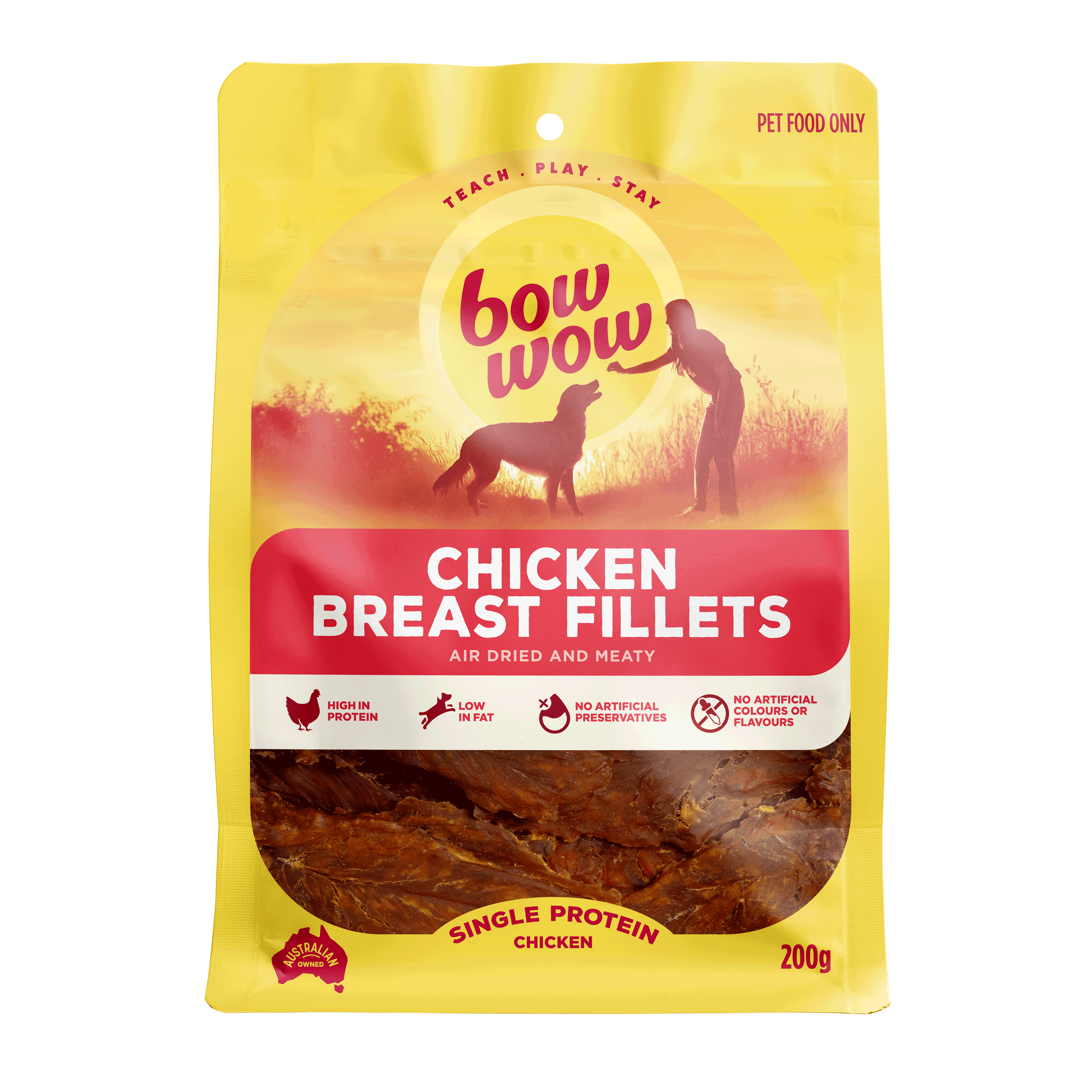 Spoil your dog with these single protein, tasty and all natural Chicken breast fillets, dried to perfection, making them tasty , easy to store so you can have them on hand anytime, anywhere. Tender and for all ages Bow Wow Chicken Breast fillets are low in fat, a good source of protein, and contain no bones or fillers.