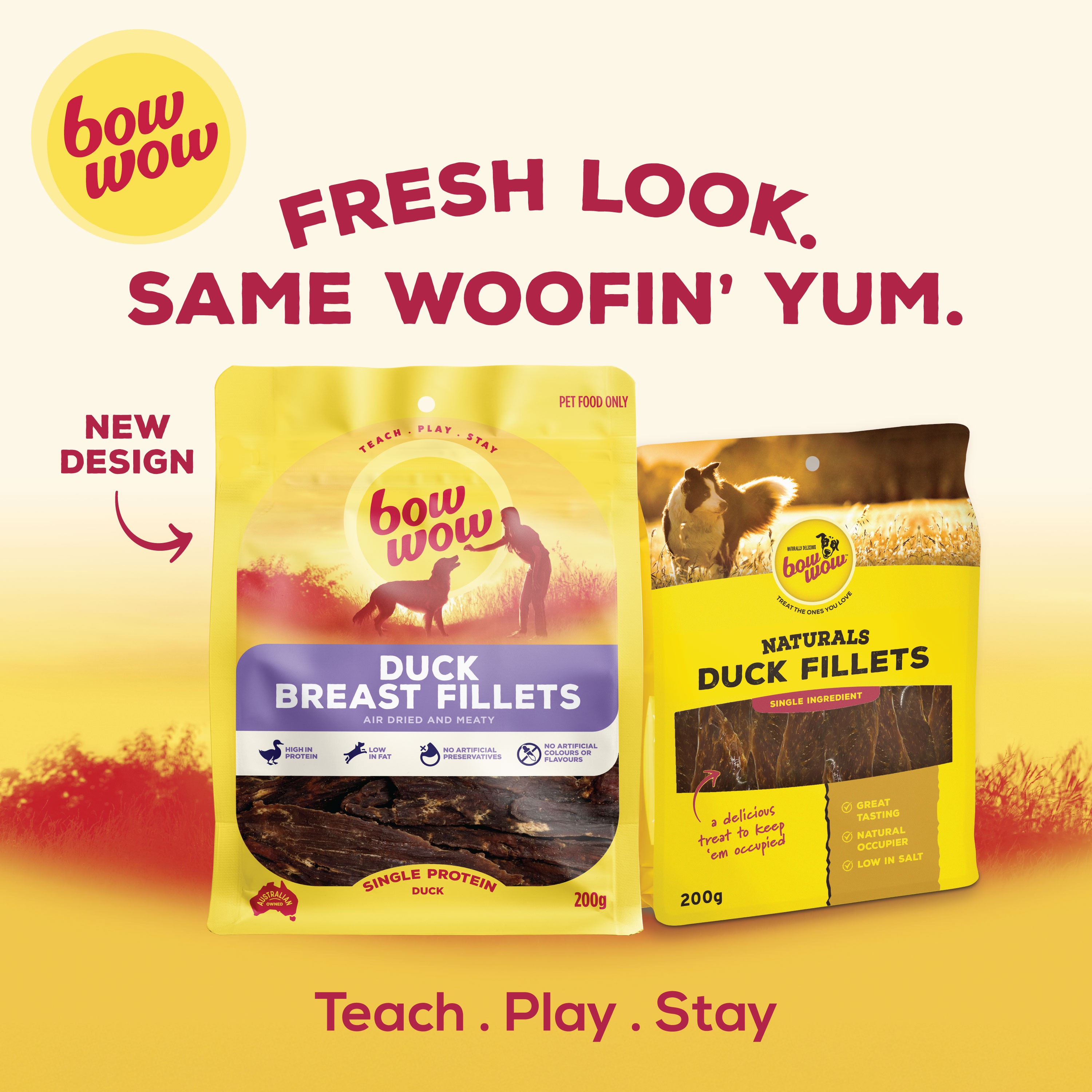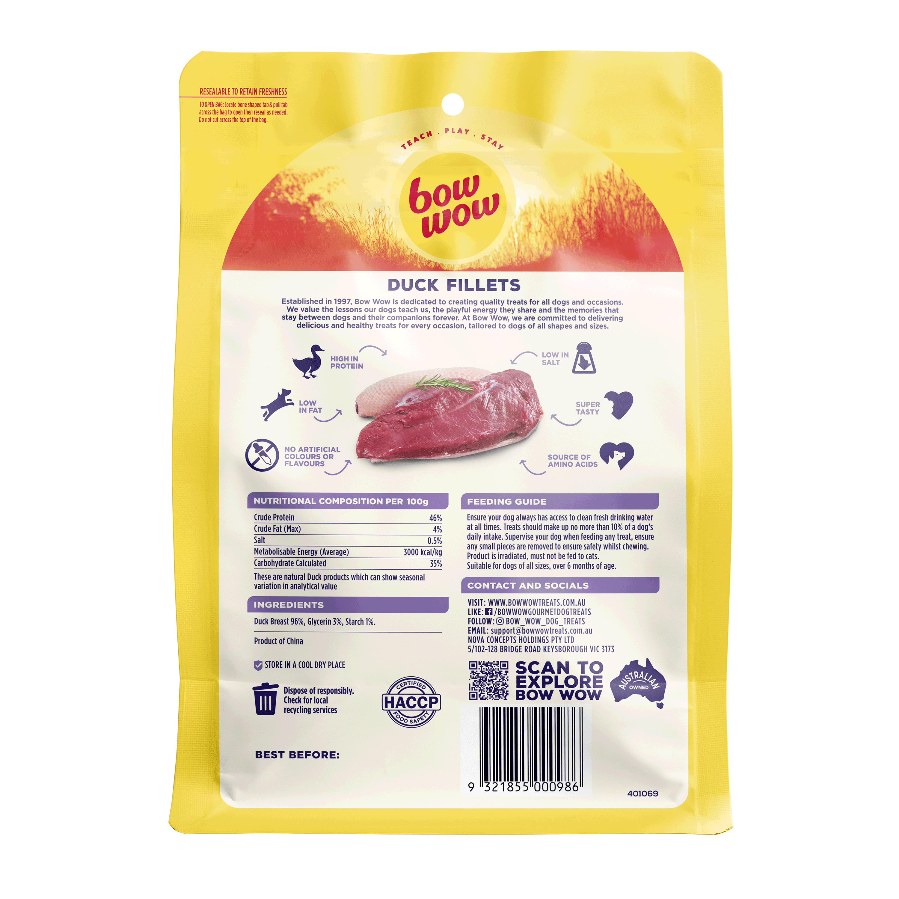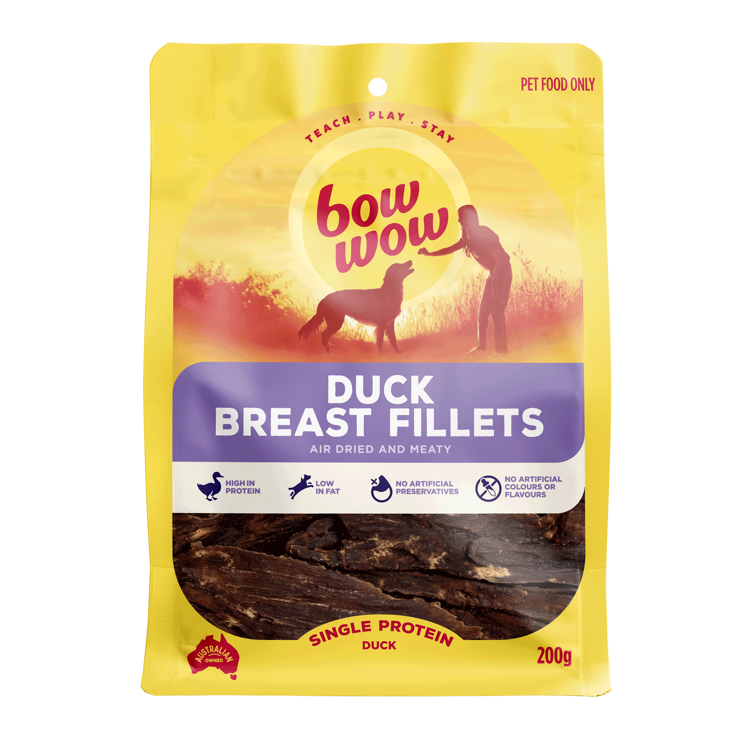 Tender and for all ages, Bow Wow Duck Fillets are low in fat, a good source of protein, and contain no bones or fillers.